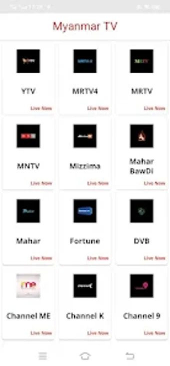 تطبيق Myanmar TV هو تطبيق Android تم تطويره بواسطة Digital Media Innovation الذي يوفر وسيلة مريحة للوصول إلى القنوات الإخبارية الشهيرة عبر الإنترنت في ميانمار. يتضمن هذا التطبيق المجاني أخبار فيديو من DVB و RFA و VOA و Eleven Web TV و Kamayut Online TV و Linker و Irrawaddy و MCN Online TV.
